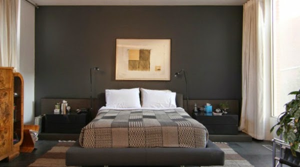 | Contemporary bedroom wall decor: dark wall, stunning picture and white curtain |